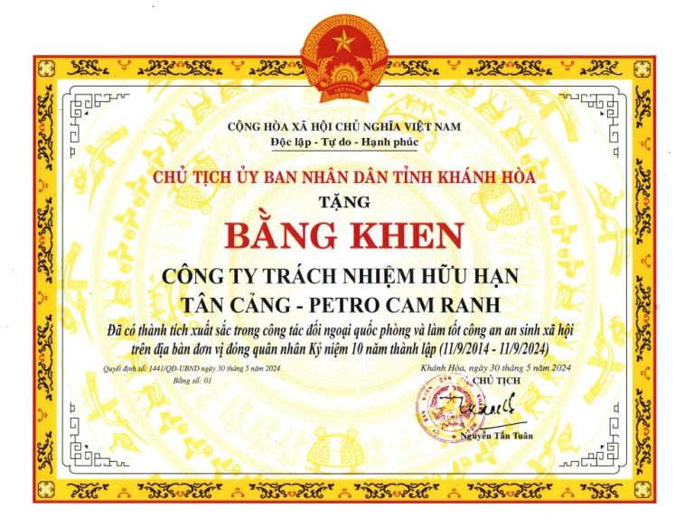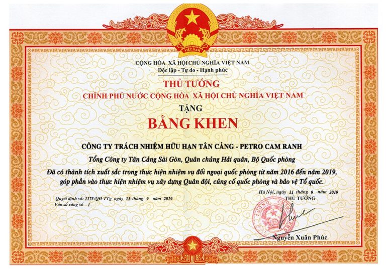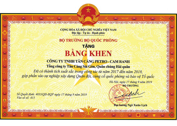With its achievements, Tan Cang – Petro Cam Ranh Company Limited has received numerous certificates of merit from the Prime Minister, the Ministry of National Defence, the Vietnam People's Navy, the People's Committee of Khánh Hòa Province, and others.